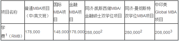 根据2014年6月公布的《同济大学2015年入学MBA招生公告》,同济大学2015年入学MBA学费总体保持不变,各项目学费分别为:
