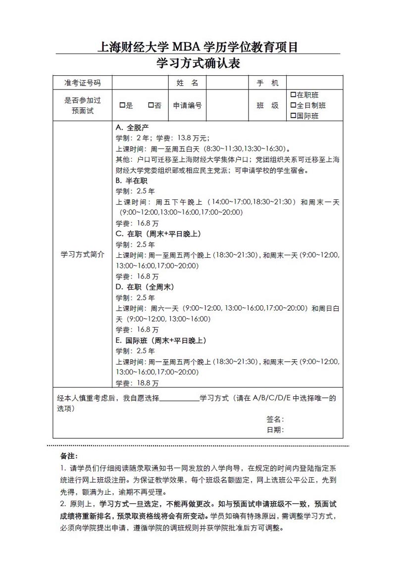 3、请各位考生密切关注上海财经大学商学院官方网站相关公告。如需任何帮助请联系我院MBA招生办公室(地址:上海市虹口区中山北一路369号上海财经大学商学院1104室 MBA中心招生办公室;咨询电话:021-65580018)。