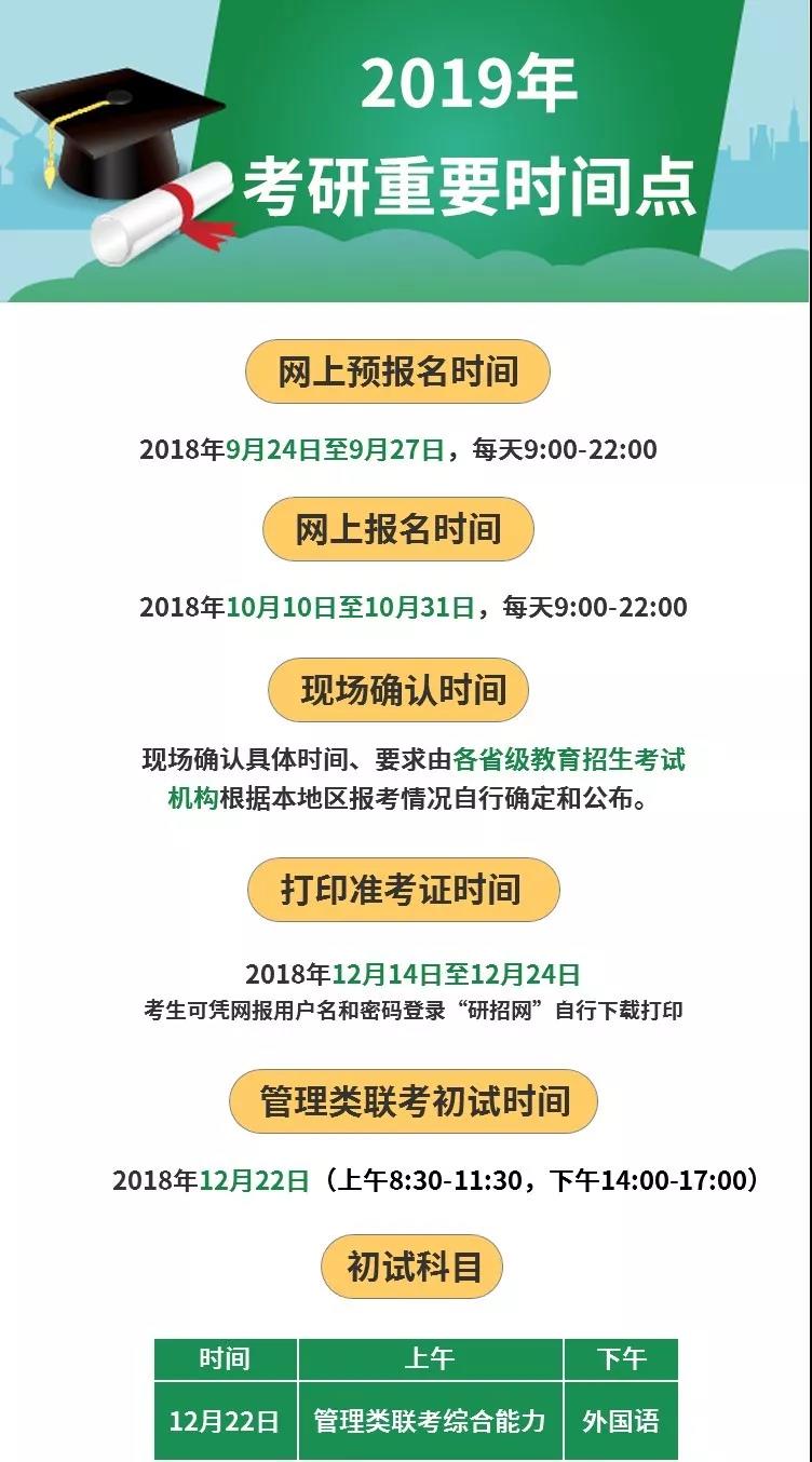 近日,《2019年全国硕士研究生招生工作管理规定》公布。2019年全国硕士研究生招生考试初试时间为:2018年12月22日至12月23日。