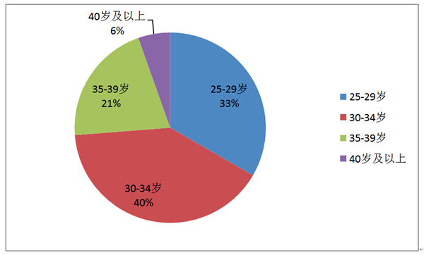 2、年龄结构,2016年录取学生平均年龄31.8岁,其中40%介于30-34岁,94%介于25-39岁。具体分布见图: