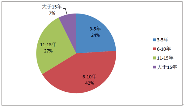 3、工作年限,平均工作年限为9.1年,工作年限在6-15年的学生占绝大多数,为69%,具体分布见下图: