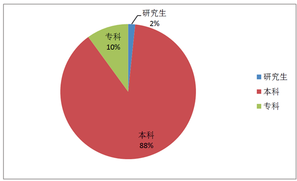 5、学历情况,其中本科毕业学生占绝大多数,比例为88%,具体见下图: