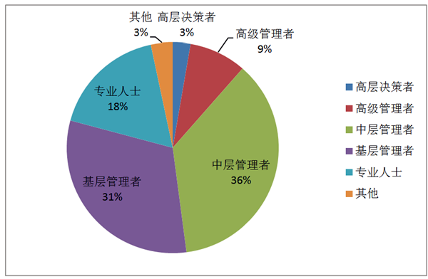 7、职务级别,将学生的职务级别分为六类,其中高层决策者占3%,中高层管理者占45%,具体分布见下图: