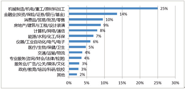 8、行业分布,将学生的工作单位按行业分为13类,其中在机械制造行业工作的学生最多,占25%,其次是金融服务和消费/贸易行业,具体分布见下图: